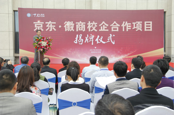 2017年4月26日,京东·徽商校企合作项目揭牌及京东集团—物流类院校产教集团倡议发起仪式在徽商职业学院紫蓬校区举行。中国物流与采购联合会周雪松女士、安徽省职业与成人教育学会常务副会长张培银、安徽省物流与采购联合会副会长周保昌、苏光友等行业学会领导,京东集团校园业务总监张晓晨、京东全国客户服务中心校企合作总经理杨程、京东华东区人力资源部总监曲来国等京东公司领导和代表,湖南现代物流职业技术学院院长邓德艾、陕西铁路工程职业学院党委副书记(纪委书记)杨云峰、武汉交通职业学院副校长梁世翔等物流行指委校企合作专委会与会领导和代表,以及徽商职业学院院长张韶、副院长窦永林、各部门(系部)负责人和学生代表参加了仪式。